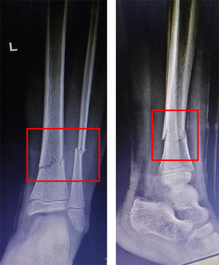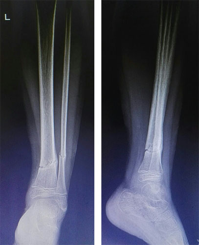 患儿,男,7岁,跌倒致左小腿肿痛畸形,即往当地医院就诊,予手法复位,石膏固定,现为伤后13天,来我院就诊,摄x线如下: