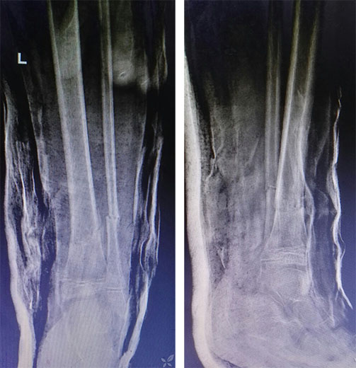 复位后20天复查X线,基本满意,可见连续骨痂通过骨折端,为避免长期跖屈导致跟腱及屈趾肌腱挛缩粘连,改踝关节功能位固定