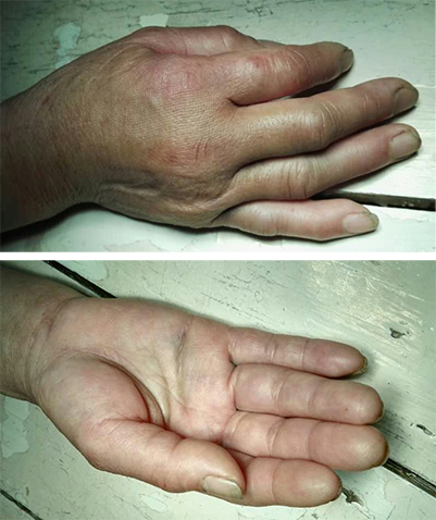 患者,女,49岁,跌倒致右手肿痛畸形6天,于外院就诊,建议切开复位钢板螺钉内固定治疗,患者拒绝。为求进一步治疗而来我院就诊,所见如下: